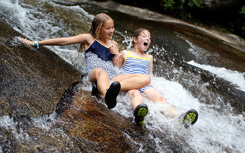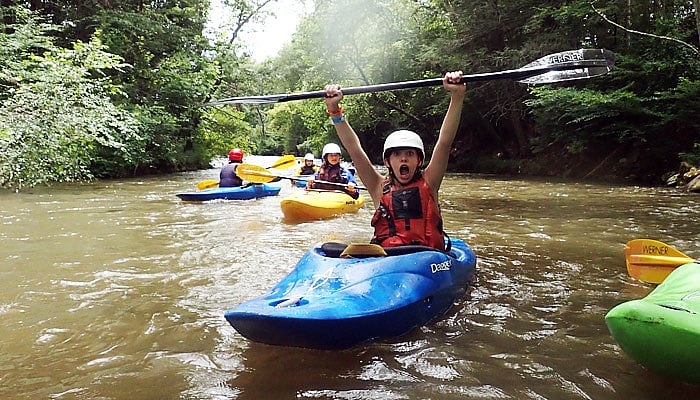Today was a big day for adventure trips, with rock climbing, canoeing, zip lining, day hiking and kayaking all pulling campers out of their regularly scheduled activities. We announce these trips during meals, sometimes at dinner to sign up a trip leaving early the next morning, and sometimes at breakfast for shorter trips, like to our zip line course for example. The kayakers were particularly excited about their trip because it was an all day paddle down the lower section of the Green River, near Saluda, NC. This section of the Green is perfect for beginners because its class I and II rapids offer plenty of opportunities to practice ferrying and catching eddies while not being too difficult. Instructors Jamie, Marjorie Ann, Leland and Andria led 9 campers down the river. A highlight of the day was stopping to play at the “Surf Rapid,” a spot where a standing wave is formed in the river allowing boaters to scoot in, pointing up stream, and be held in place. Surfing in the mountains of North Carolina! Now after tackling the Green, these girls are excited to paddle more challenging rivers. Stay tuned, because next week, we’ve got plans!