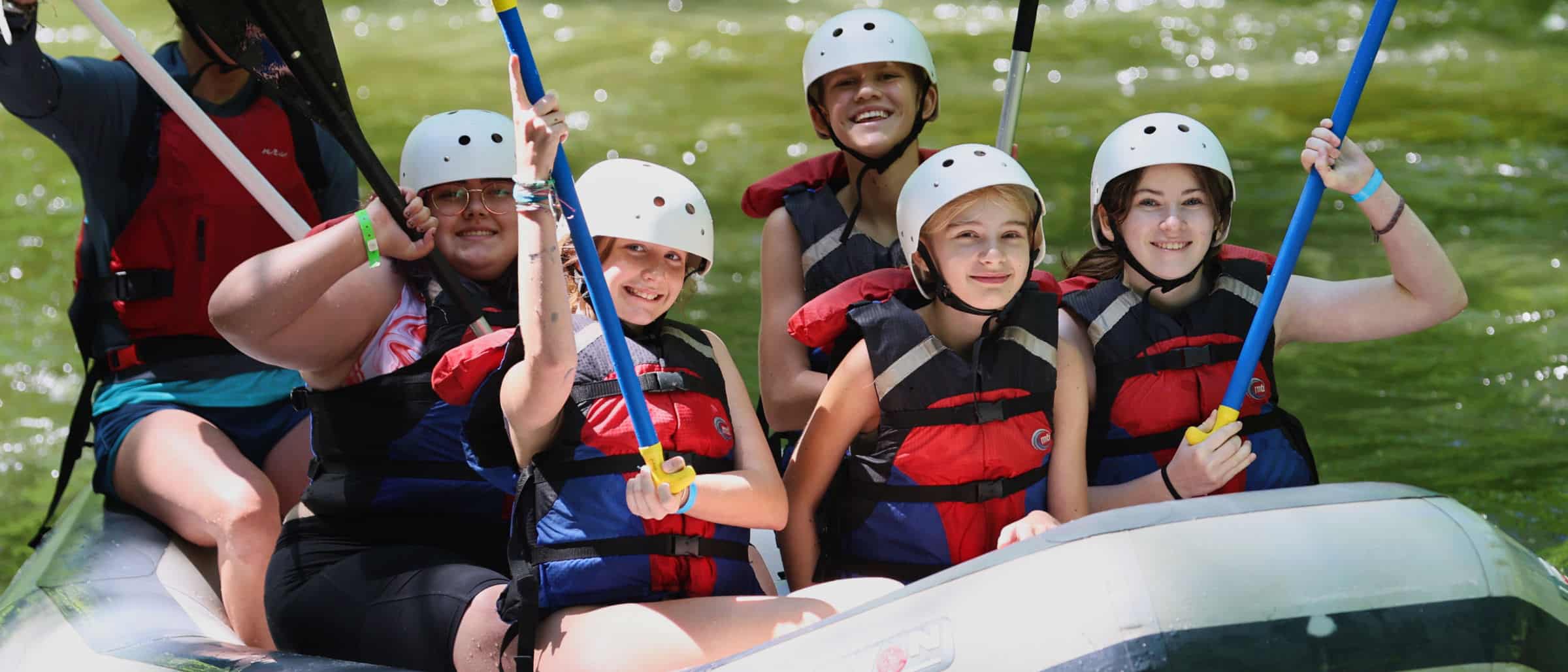 All of the mini session Middlers and Seniors who wanted to go whitewater rafting took their trip today. With a few remaining full sessions girls joining them, this turned out to be 55 campers. About half of those elected to spend the night beforehand at our Nantahala outpost property in Swain County. This is another chance to be outside and enjoy a campfire, complete with s’mores of course, before bed. The girls had a grand time singing songs, taking turns telling jokes, all while staring hypnotically at the flickering fire. Around 9am we met our veteran rafting guides and all of the RBC gear at the river’s put-in, and after suiting up and hearing the guides’ safety instructions, the rafting hit the water under glorious, bright sunshine. For the next two hours, it was a wild ride filled with laughing and squeals of delight with every crashing wave of the rapids. This last photo was taken at the final big rapid called the “Nantahala Falls” and as you can see, it’s a great one. After a good sized hole at the top, all of the river channels in a Class III drop producing this kind of splash. It never fails to get everyone’s heart pumping, and once safely at the bottom, a smile on their faces.