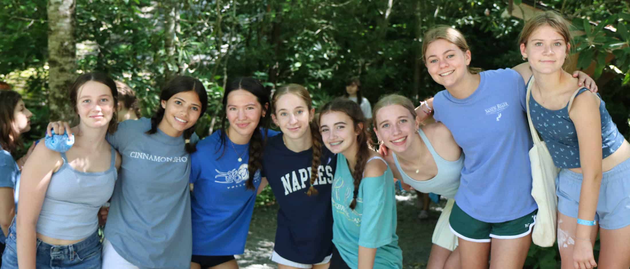 One of the outdoor adventure trips available to all Rockbrook Middlers and Seniors (girls who have finished the 5th grade and older) is whitewater rafting on the Nantahala River over in Swain County. We don’t make girls sign up for these trips before arriving at camp (or charge extra for them) because we know part of the fun is deciding to go, or not go, with your friends. And when there are two options available -a day-long trip or an overnight camping version -making that decision is important. These girls just want to be together! This can make the logistics of planning rafting trips complicated, but we have plenty of experience making it happen. Like today, when surprisingly 77 girls wanted to raft, we simply ran an extra raft of girls on both trips to accommodate everyone. After meeting our veteran guides at the river’s put-in, and suiting up in the RBC gear (Rockbrook has a special permit to do all this ourselves), the morning trip hit the first rapid called “Patton’s Run” in bright sunshine. The girls had a ball over the next two hours, laughing and screaming with every bump and splash. Some of the rapids on the Nantahala really get your heart pumping, like the one in this photo, the final big rapid called the “Nantahala Falls.” There are calm spots too, making a nice balance of floating (and chances to sing camp songs!) and high adventure whitewater. The afternoon trip also started out warm and sunny, but did have some rain for the last 30 minutes. This didn’t stop the fun however. Their Rockbrook Spirit, a kind of collective euphoria, kicked in and the girls just sang louder and paddled harder.