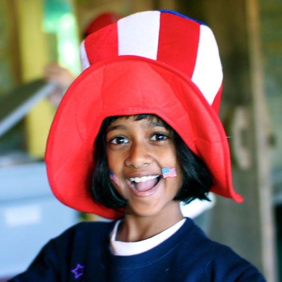 Of course, horses were not the only thing decorated in red, white and blue today. You could see it everywhere around camp! In the dining hall on table decorations, on hats, headbands, beaded necklaces, t-shirts and other things people were wearing, some of the food we ate today (Oh, those brownie cakes!), and the body paint that seemed to become more prevalent as the day progressed. Similarly, the girls sang their favorite patriotic songs at meals— “Yankee Doodle Dandy” and “You’re a Grand Old Flag,” for example —adding to the normal lively Rockbrook songs. There was no doubt these girls were ready to celebrate!