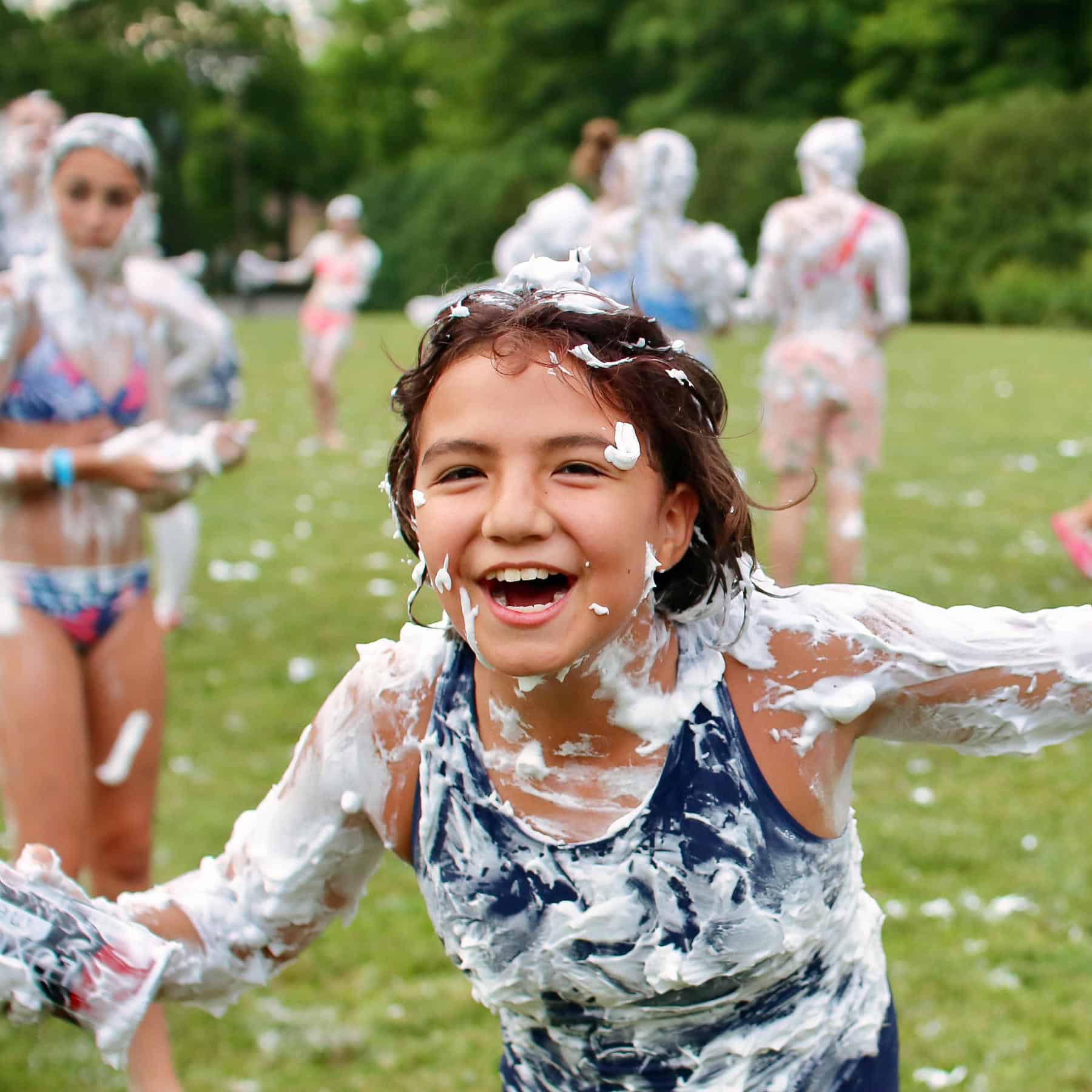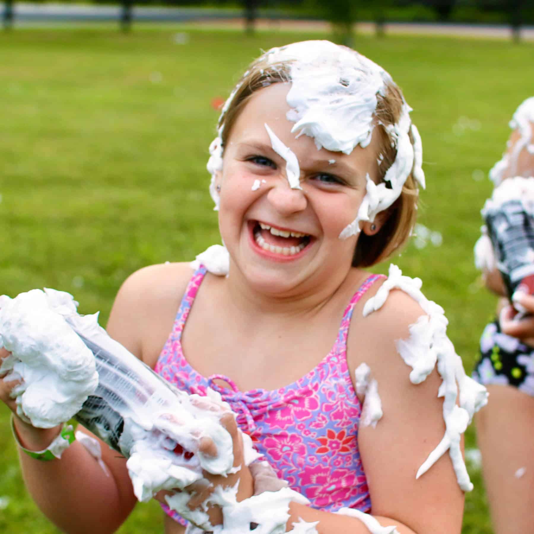 It doesn’t take long before most everyone is covered with shaving cream, and in some cases completely covered. That too is simply funny to see. But the fun doesn’t stop there. There are hairstyles to form (mohawks seem popular), high fives and other tricks to perform. Girls drew letters in the foam, posed for photos and kept laughing the whole time. Meanwhile, our now slippery campers took turns sliding down a wet sheet of plastic, zooming on their bellies, here too, grinning all the way. Sounds like fun, right? It is! It’s the kind of excellent fun that’s hard to find anywhere else.