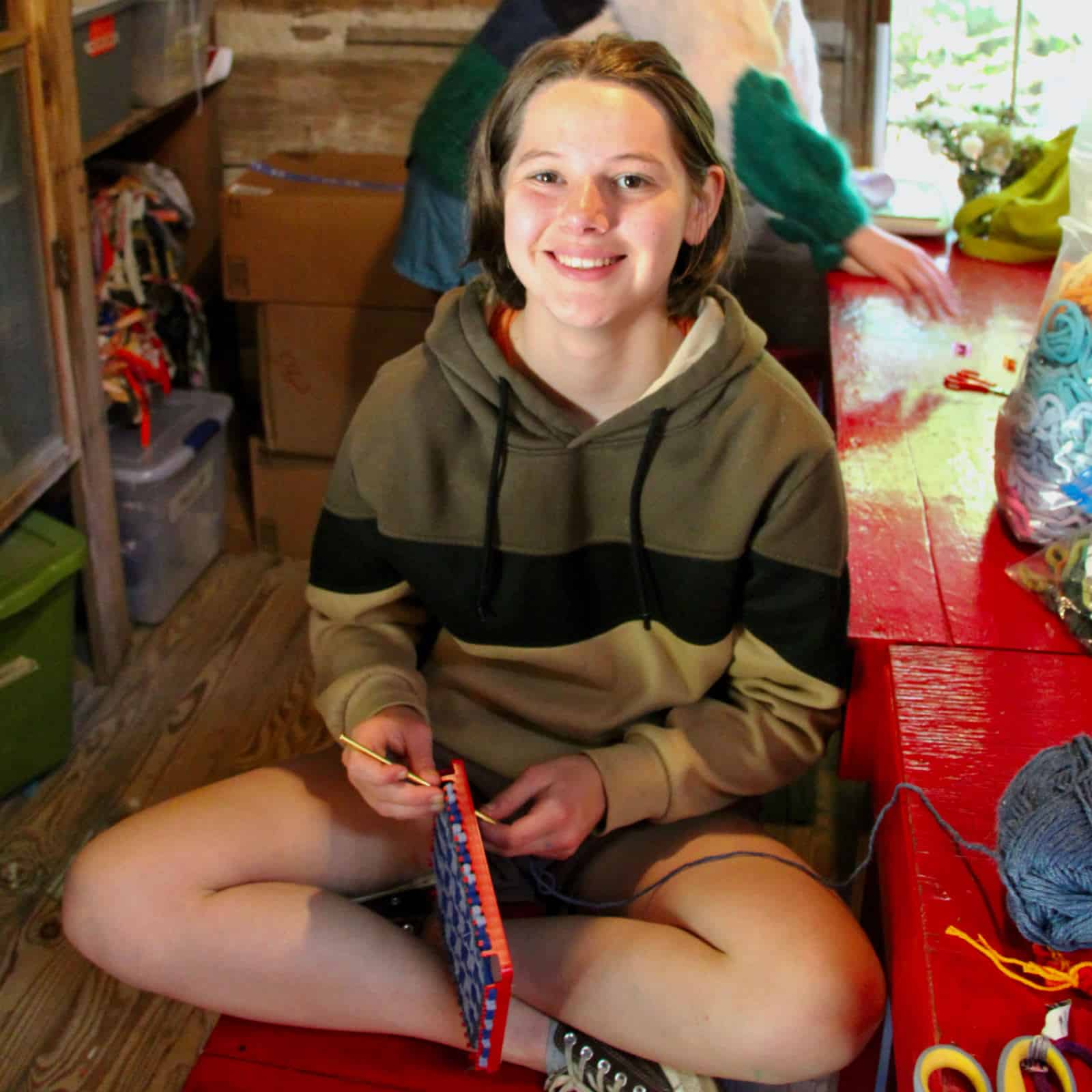 One of my favorite things to do at camp is to wander around and find groups of girls happily busy with something, and then stop to hang out with them a while. It’s enjoyable because they are always keen to explain what they’re doing, to answer my questions, and generally to chat about whatever is on their minds. This can happen anytime of the day at one of the tetherball courts, for example. There’ll always be a group huddled around taking turns challenging the winner of the last game. The same is true at the Gagaball arena, at the lake when it’s open for free swim periods before lunch and dinner, at the creek passing by the Curosty cabin, on the grassy camp hill, or one of the many porches around camp.