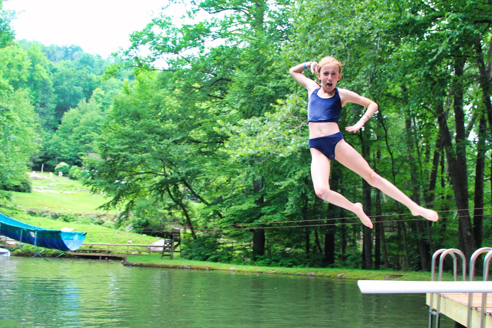 The variety of cabin day activities today was impressive. Groups took short hikes on the camp property to Rockbrook Falls for playing in the water, and Castle Rock for soaking in the long view of the French Broad valley. Some had played a series of relay games at the landsports field. Others devised complex protections for an egg drop game. There was a gagaball tournament, an archery clinic, and a diving board trick show. Other groups worked jewelry making into their time together.