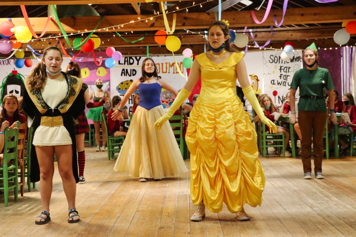 Our evening program tonight got everyone dressed up and dancing because it was an all-girls dance party with a “prom” theme. Actually it was three dance parties, since each line (age group) held its own version in a different location. The costumes ranged from simple dresses to tie-dye t-shirts, and included a few hats, necklaces of beads, and tutus. The juniors were excited to try out a few line dances in the dining hall, while the middlers took over the hillside lodge. Since the seniors are the largest group they jumped and danced in the gym. No boys in sight, these girls know how to have a good time being silly, singing and twirling with each other. Of course, they were more than happy to pause for a quick “prom photo.” Be sure to check the photo gallery to see how everyone was dressed.